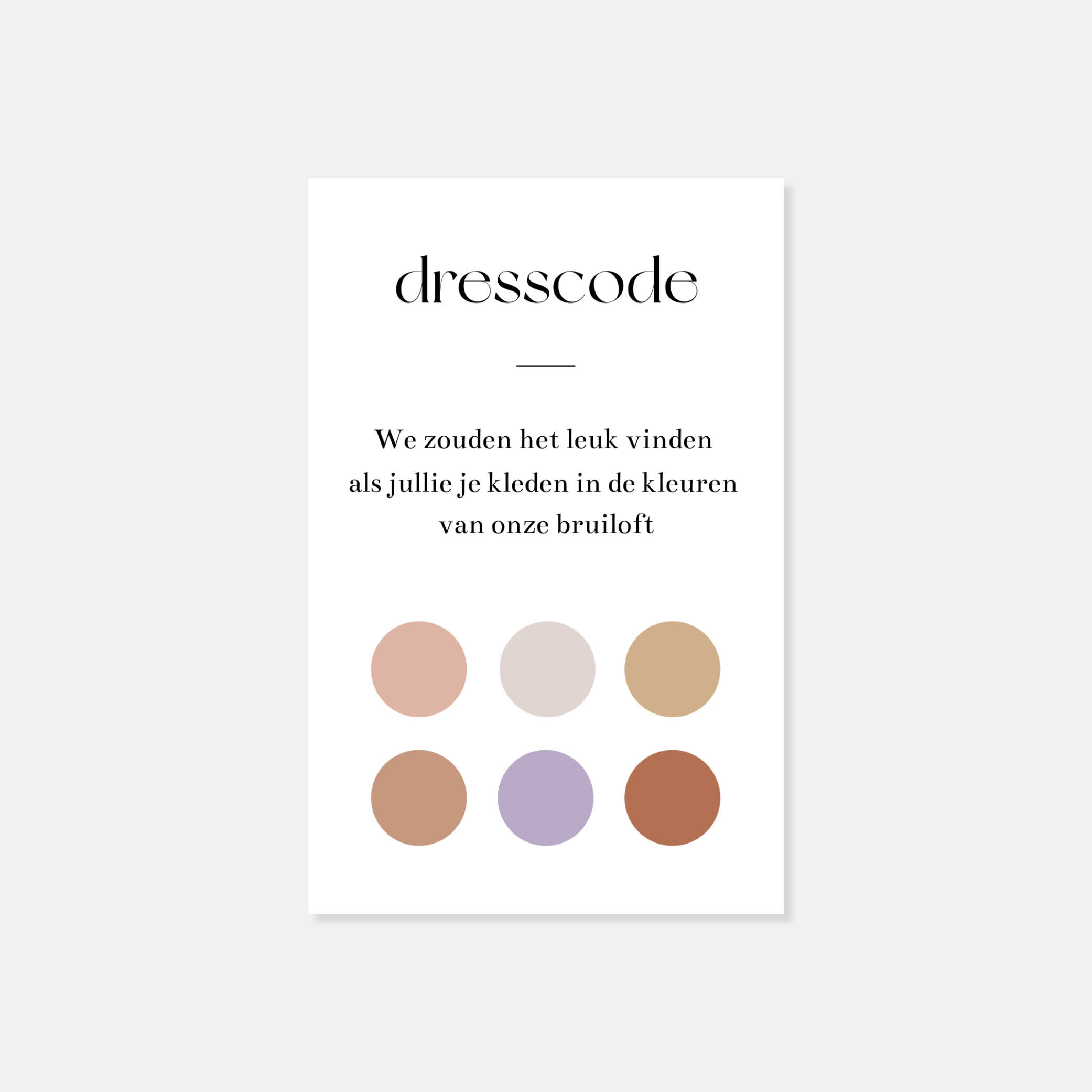 Voor bij de touwkaart: leuke dresscode kaartjes! De gekleurde bolletjes op de kun je de themakleuren geven van jullie bruiloft. Heb je hier hulp bij nodig? Stuur een berichtje, we helpen je graag verder. De kaartjes hebben een formaat van 5,5 x 8,5 cm.
