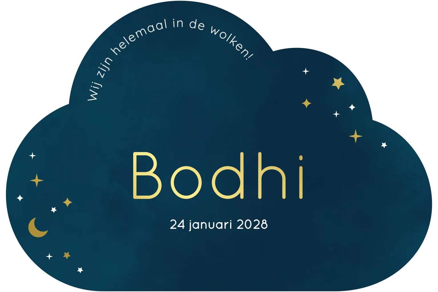 Een geboortekaartje in wolkvorm met sterretjes in goudfolie. De achtergrond, het lettertype en de kleur zijn naar wens aan te passen. Hulp nodig bij het ontwerpen van je kaartje? Stuur mij een berichtje, ik help je graag!