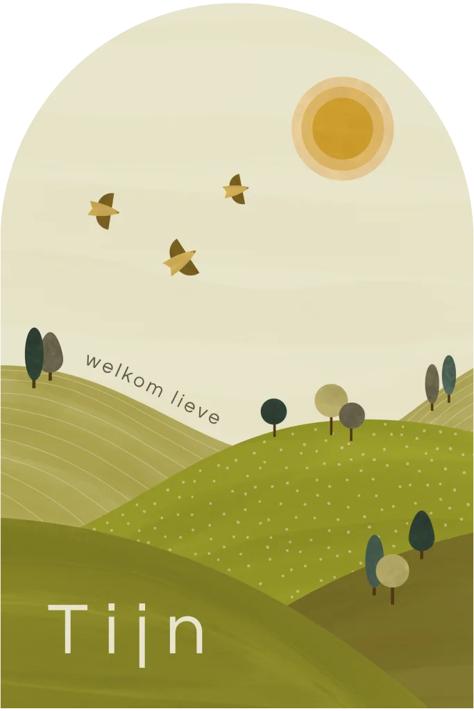 geboortekaartje Tijn in boogvorm met landschap en vogels