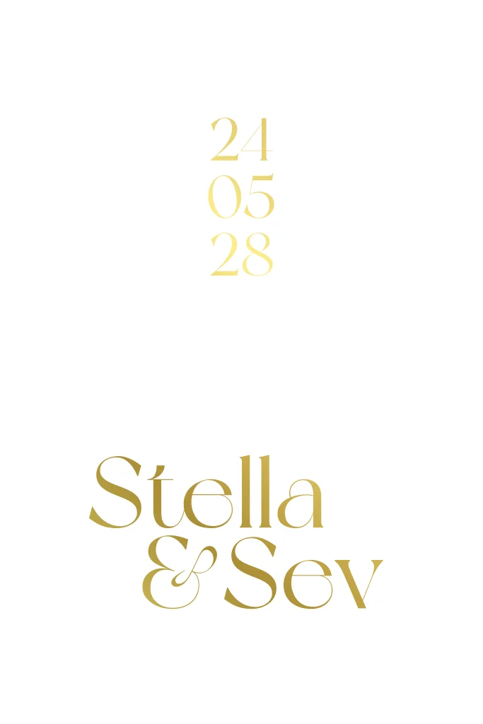 Een moderne trouwkaart met goudfolie uitgesneden in een unieke vorm. Je kunt de kaart naar wens aanpassen, Liever een ander formaat of misschien hulp nodig bij het ontwerpen? Stuur een berichtje, we helpen je graag verder!