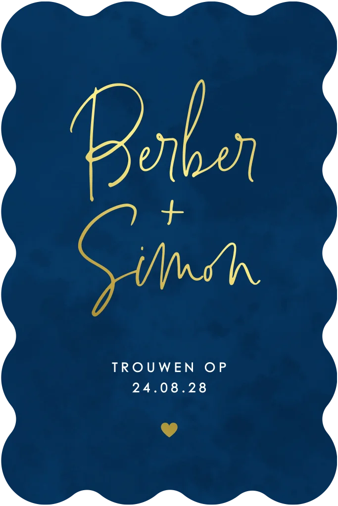 Een moderne trouwkaart met goudfolie uitgesneden in een unieke vorm. Je kunt de kaart naar wens aanpassen, Liever een ander formaat of misschien hulp nodig bij het ontwerpen? Stuur een berichtje, we helpen je graag verder!