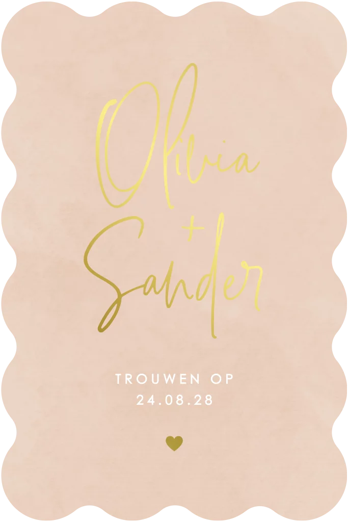 Een moderne trouwkaart met goudfolie uitgesneden in een unieke vorm. Je kunt de kaart naar wens aanpassen, Liever een ander formaat of misschien hulp nodig bij het ontwerpen? Stuur een berichtje, we helpen je graag verder!