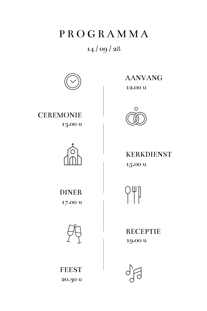 Gedrukt op transparant papier: deze dagprogrammakaart om te bundelen met je trouwkaart. Een handig overzicht voor je gasten zodat ze weten hoe de dag eruitziet. Pas het ontwerp aan naar eigen wens in stijl van jullie uitnodiging. Hulp nodig? Stuur een berichtje, we helpen graag verder!