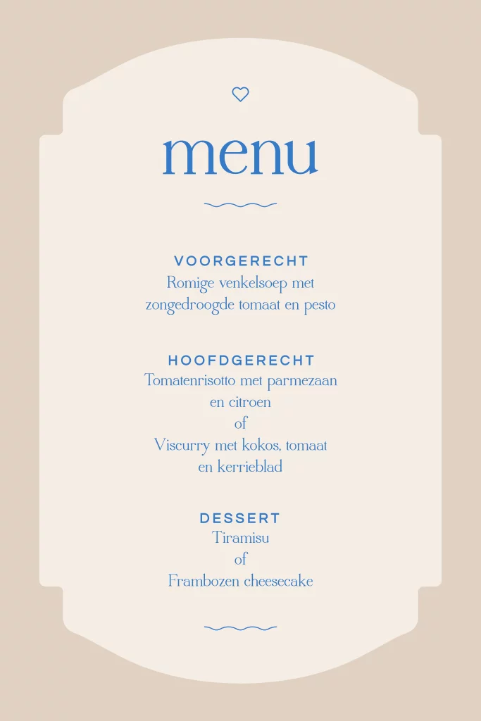 Menukaarten voor op je bruiloft in stijl van je trouwkaart. Pas het design aan naar eigen wens. Hulp nodig of wil je een ander formaat kaart? Stuur een berichtje, we helpen je graag verder!