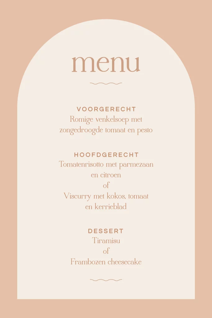 Menukaarten voor op je bruiloft in stijl van je trouwkaart. Pas het design aan naar eigen wens. Hulp nodig of wil je een ander formaat kaart? Stuur een berichtje, we helpen je graag verder!