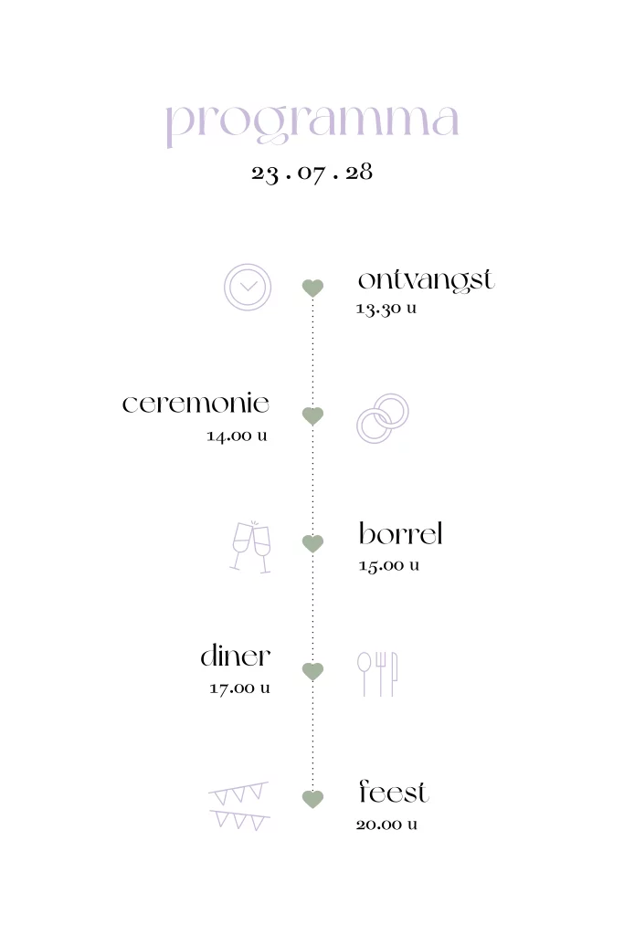 Met een dagprogrammakaart zorg je voor een handig overzicht voor je gasten zodat ze weten hoe de dag eruitziet. Pas het ontwerp aan naar eigen wens in stijl van jullie uitnodiging. Hulp nodig? Stuur een berichtje, we helpen graag verder!