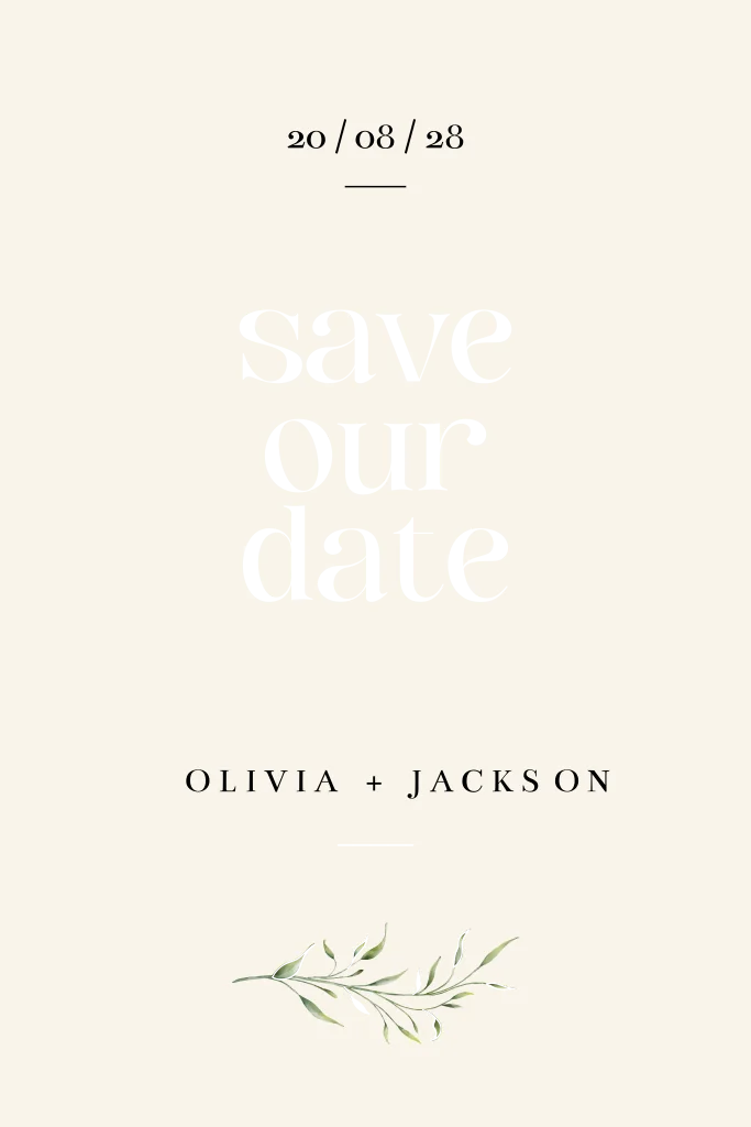 Save the date kaart met sierlijke tak en goudfolie. Pas het design aan naar eigen wens. Wil je dit ontwerp in een ander formaat, of heb je hulp nodig bij het ontwerpen? Stuur een berichtje, we helpen je graag verder!