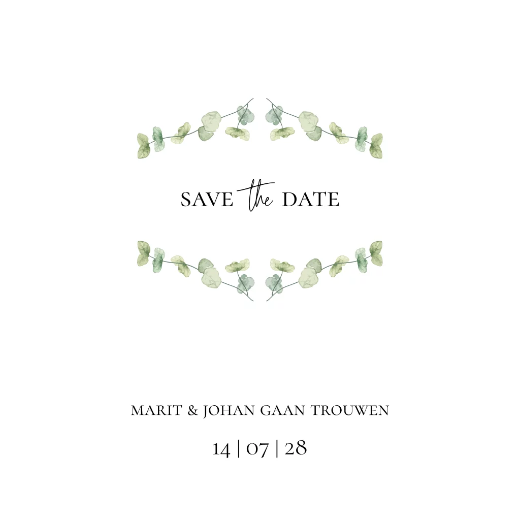 Een save the date kaart met eucalyptus takken. Pas het ontwerp aan naar eigen wens. Hulp nodig bij het ontwerpen van je kaart? Stuur een berichtje, we helpen je graag verder!