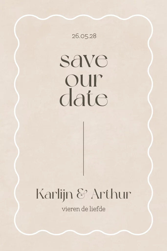Een moderne save the date kaart met grafische outline. Pas het ontwerp aan naar eigen wens. Hulp nodig bij het ontwerpen van je kaart? Stuur een berichtje, we helpen je graag verder!
