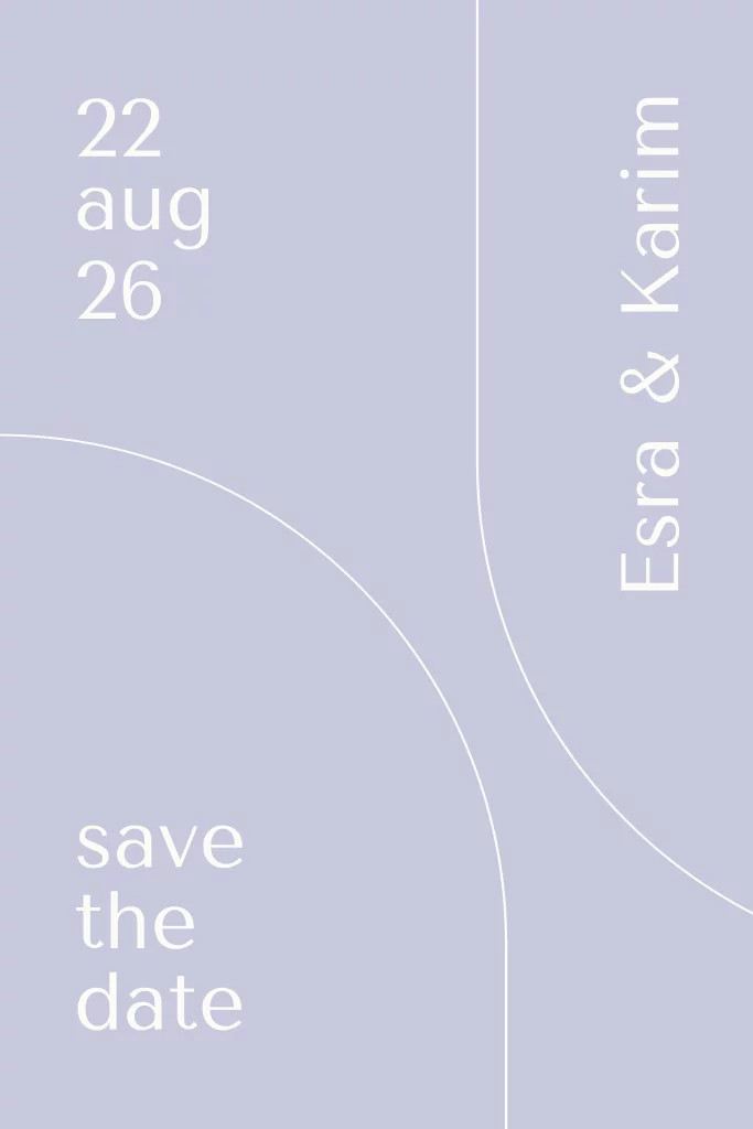 Een moderne save the date kaart met grafische outline boog. Pas het ontwerp aan naar eigen wens. Hulp nodig bij het ontwerpen van je kaart? Stuur een berichtje, we helpen je graag verder!