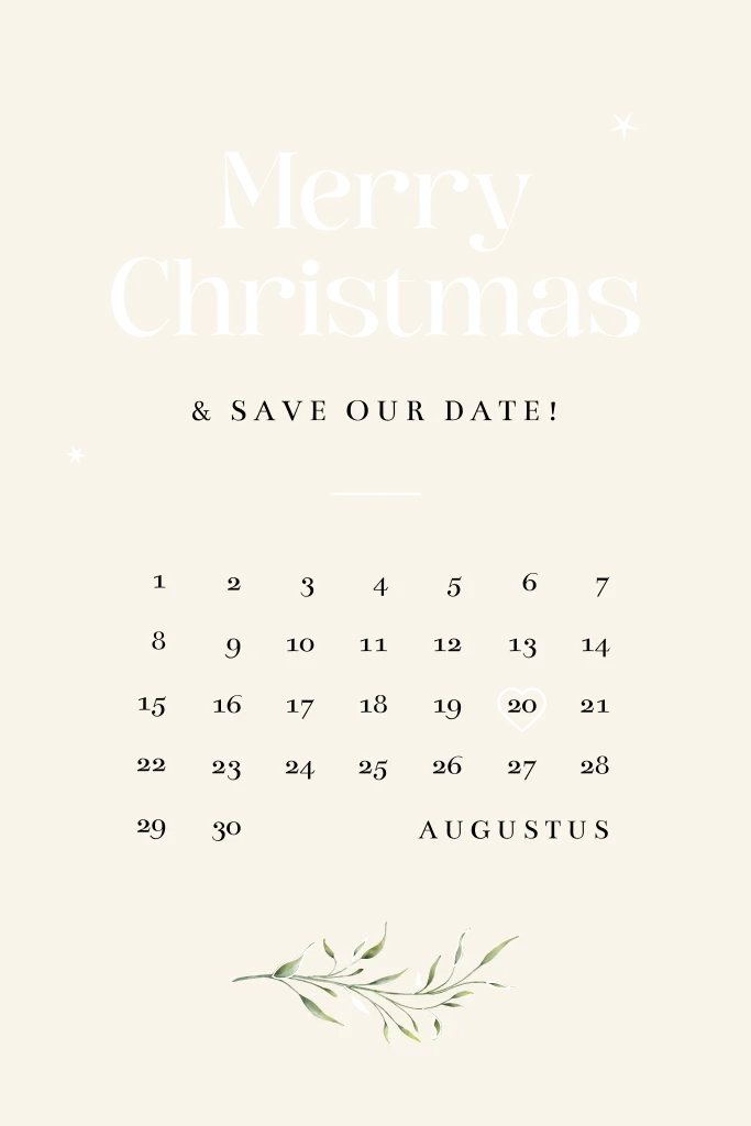Verras jullie bruiloftsgasten met warme kerstgroeten én de datum van jullie grote dag met deze feestelijke kerst save the date kaart. Pas het design aan naar eigen wens. Wil je dit ontwerp in een ander formaat, of heb je hulp nodig bij het ontwerpen? Stuur een berichtje, we helpen je graag verder!