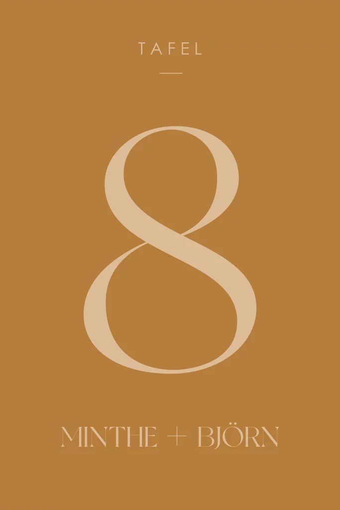 Diner in stijl en ontwerp tafelnummer kaarten die passen bij je trouwkaart! Pas het ontwerp aan naar eigen wens. Vul het tafelnummer in en maak een kopie van je ontwerp indien je meerdere tafelnummer kaarten nodig hebt. Hulp nodig? Stuur een berichtje, we helpen je graag verder.