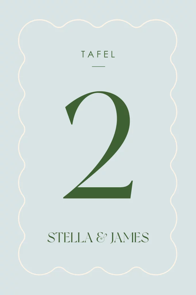 Diner in stijl en ontwerp tafelnummer kaarten die passen bij je trouwkaart! Pas het ontwerp aan naar eigen wens. Vul het tafelnummer in en maak een kopie van je ontwerp indien je meerdere tafelnummer kaarten nodig hebt. Hulp nodig? Stuur een berichtje, we helpen je graag verder.
