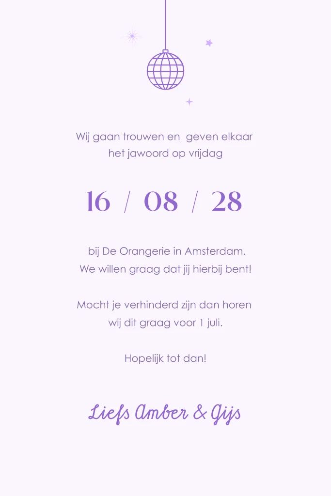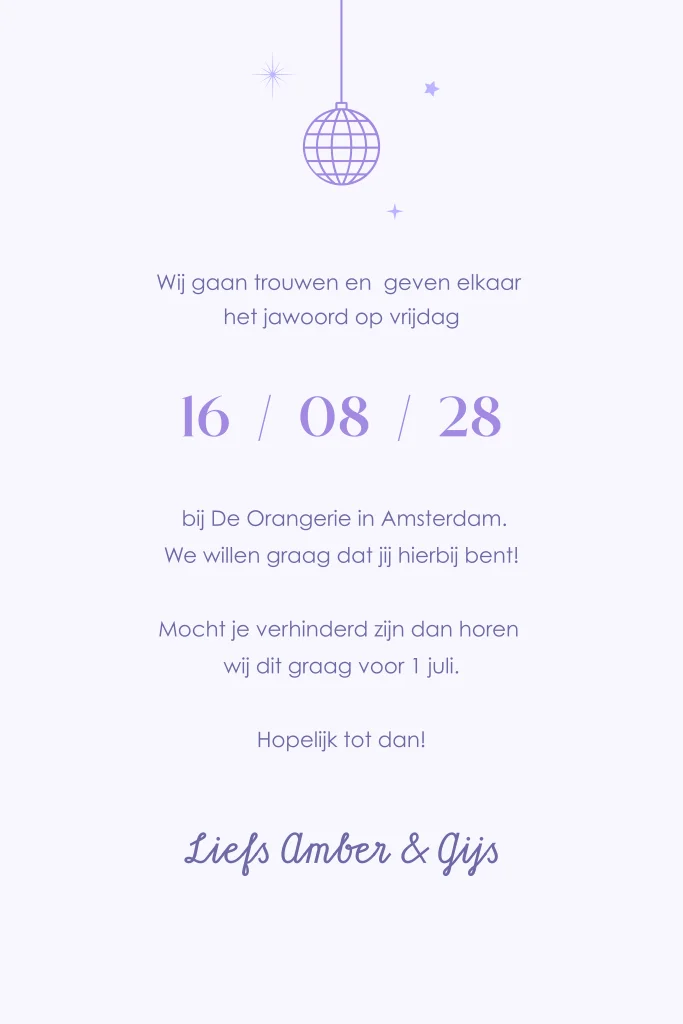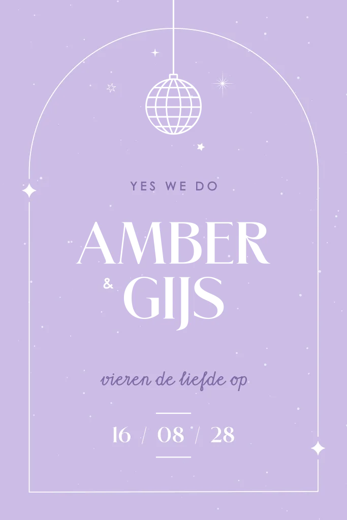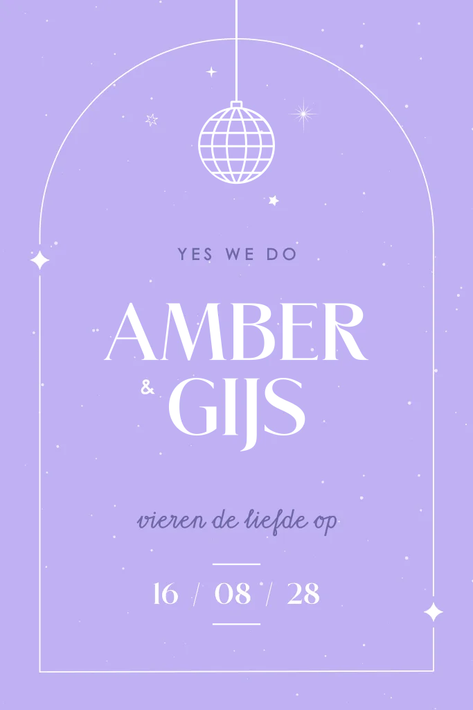 Een feestelijke trouwkaart met discobol en sterren voorzien van goudfolie elementen. Bewerkt de achtergrond, het lettertype en kleuren naar eigen wens. Hulp nodig of wil je dit ontwerp in een ander formaat? Stuur een berichtje, we helpen je graag verder!