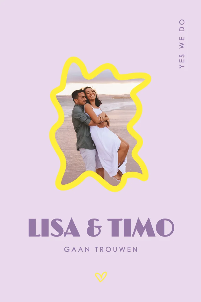 Kleurrijke trouwkaart met foto en speels kader. Pas het design aan naar eigen wens. Voeg je eigen foto toe door de roze achtergrond opzij te schuiven en de voorbeeldfoto te verwijderen. Voeg je eigen beeld toe en zet de transparantie tijdelijk op 50% om het rode kader goed te zien. Pas het formaat aan zodat de foto mooi in het kader valt. Als je tevreden bent, zet de transparantie terug op 0% en plaats de foto via het volgorde-icoon (tweede van boven) op de achtergrond. Hulp nodig of wil je dit ontwerp in een ander formaat? Stuur een berichtje, we helpen je graag verder!