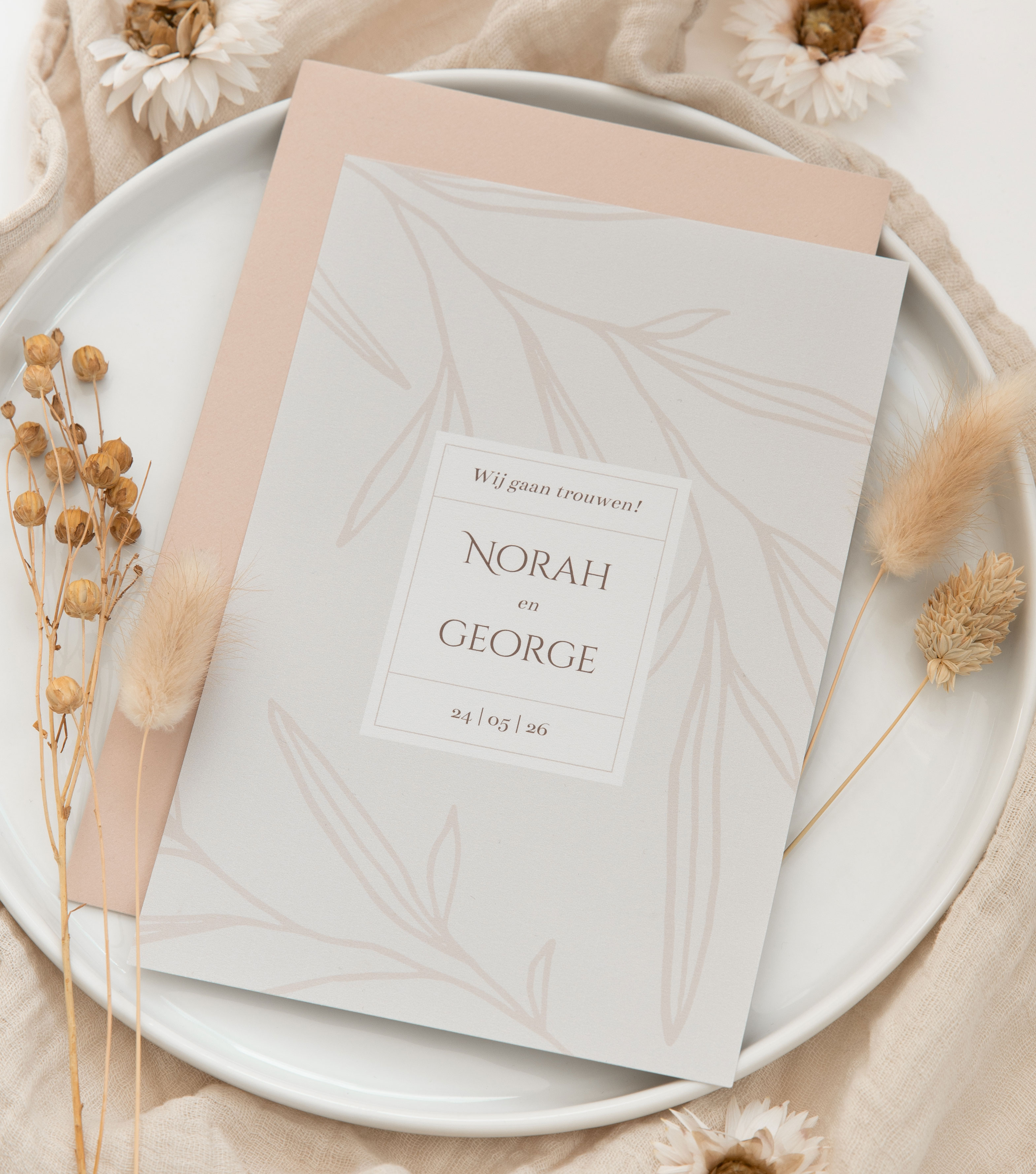trouwkaart beige met geïllustreerde bladeren