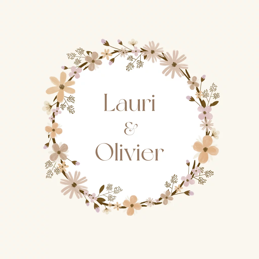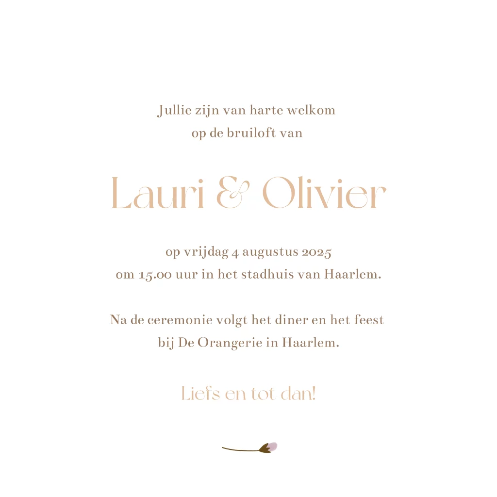 trouwkaart met bloemenkrans in beige natuurtinten. Pas het design aan naar eigen wens. Foliedruk is naar wens toe te voegen. Wil je dit ontwerp in een ander formaat, of heb je hulp nodig bij het ontwerpen? Stuur mij een berichtje, ik help je graag!