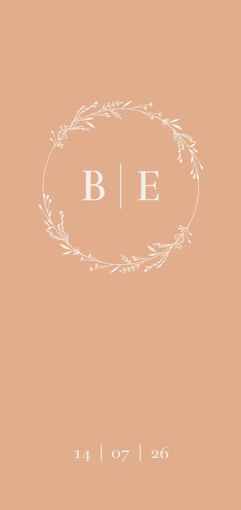 Trouwkaart met bloemenkrans en initialen. Pas het design aan naar eigen wens. Wil je dit ontwerp in een ander formaat, of heb je hulp nodig bij het ontwerpen? Stuur een berichtje, we helpen je graag verder!