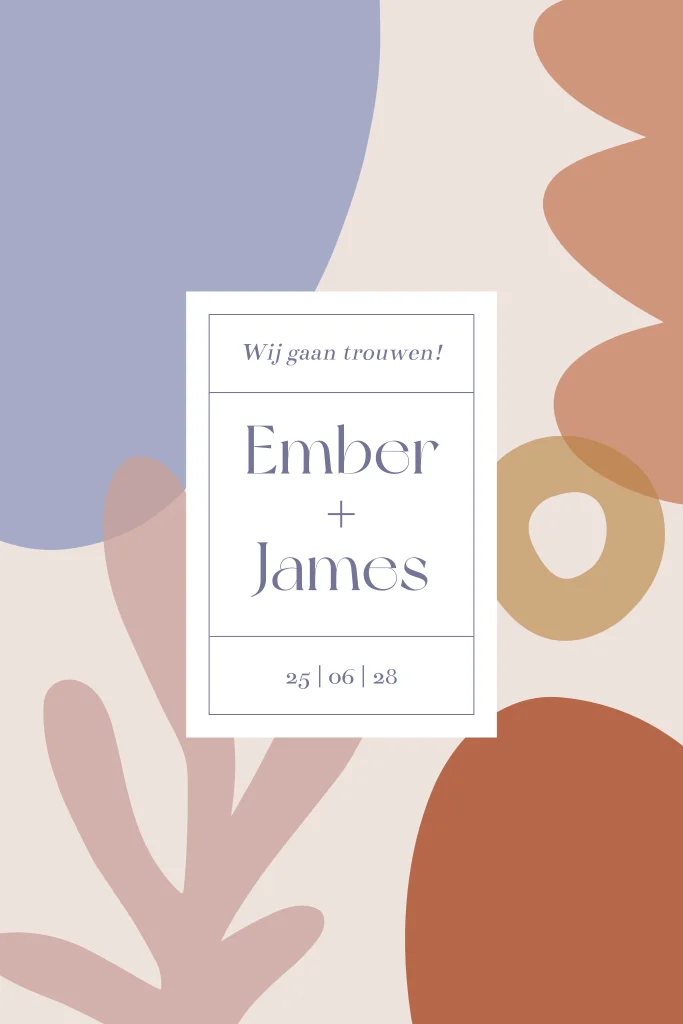 Een kleurrijke trouwkaart met grafische abstracte vormen. Pas het design aan naar eigen wens. Wil je dit ontwerp in een ander formaat, of heb je hulp nodig bij het ontwerpen? Stuur een berichtje, we helpen je graag verder!