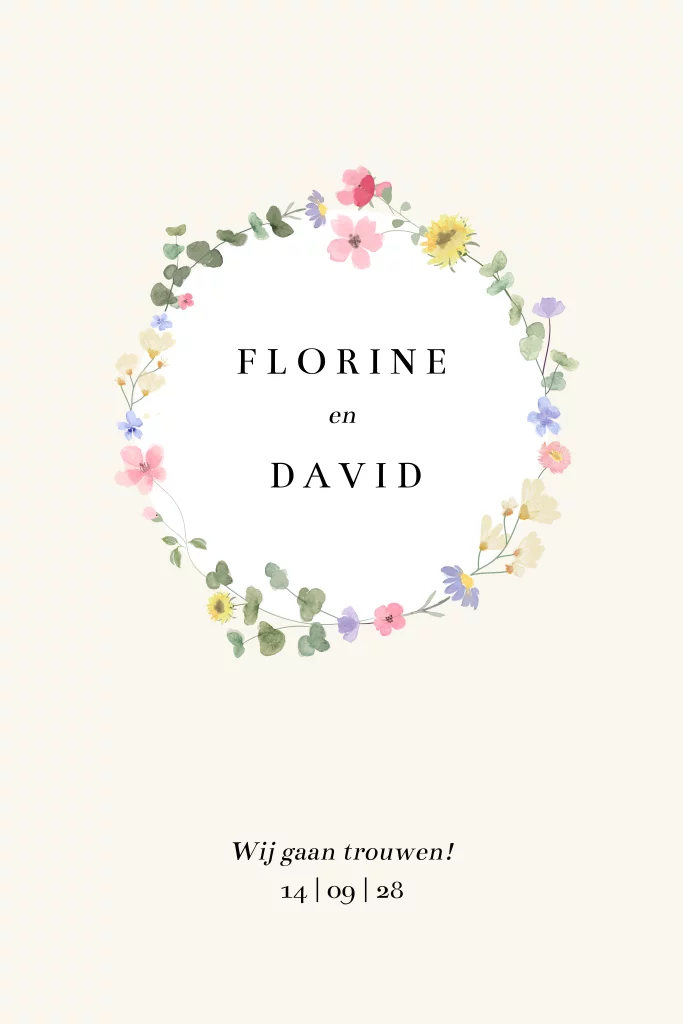 trouwkaart met kleurrijke bloemenkrans
