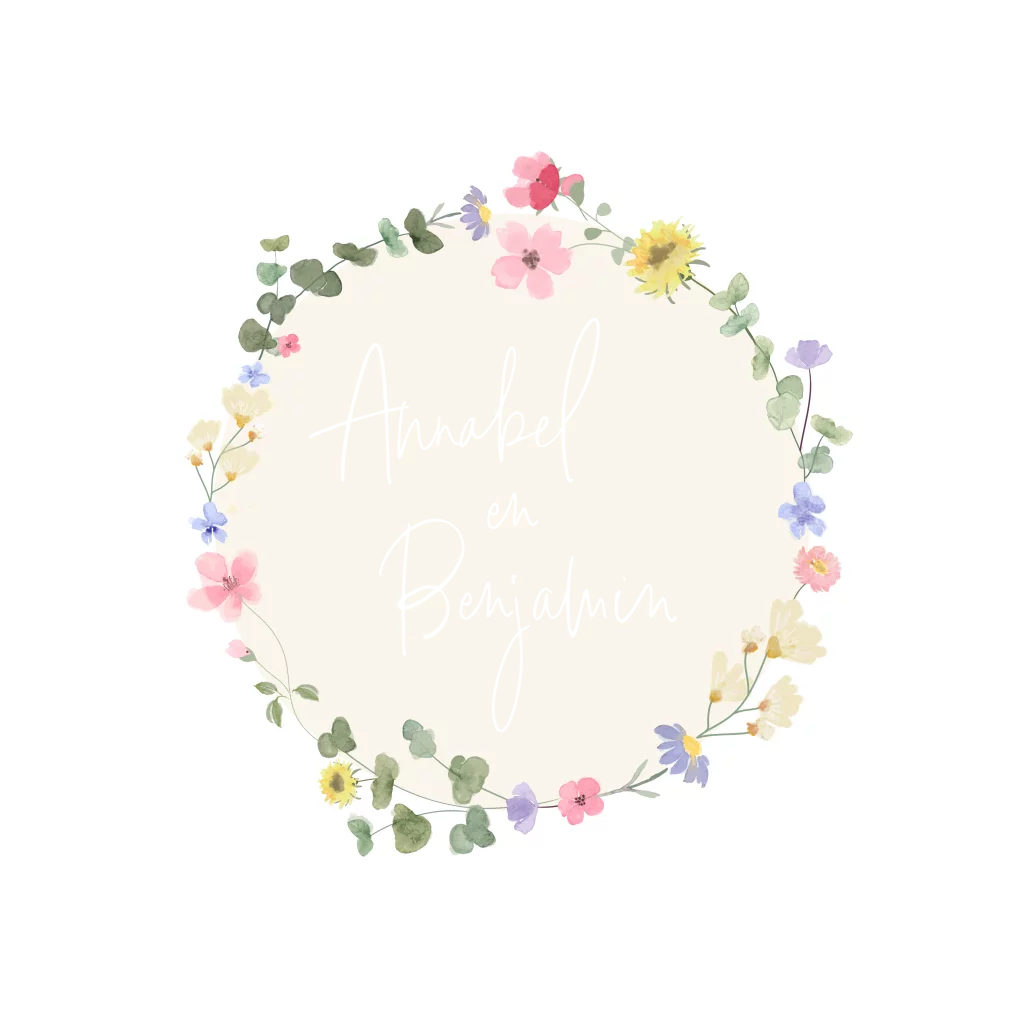Trouwkaart met kleurrijke bloemenkrans en zilverfolie. Pas het design aan naar eigen wens. Wil je dit ontwerp in een ander formaat, of heb je hulp nodig bij het ontwerpen? Stuur een berichtje, we helpen je graag verder!
