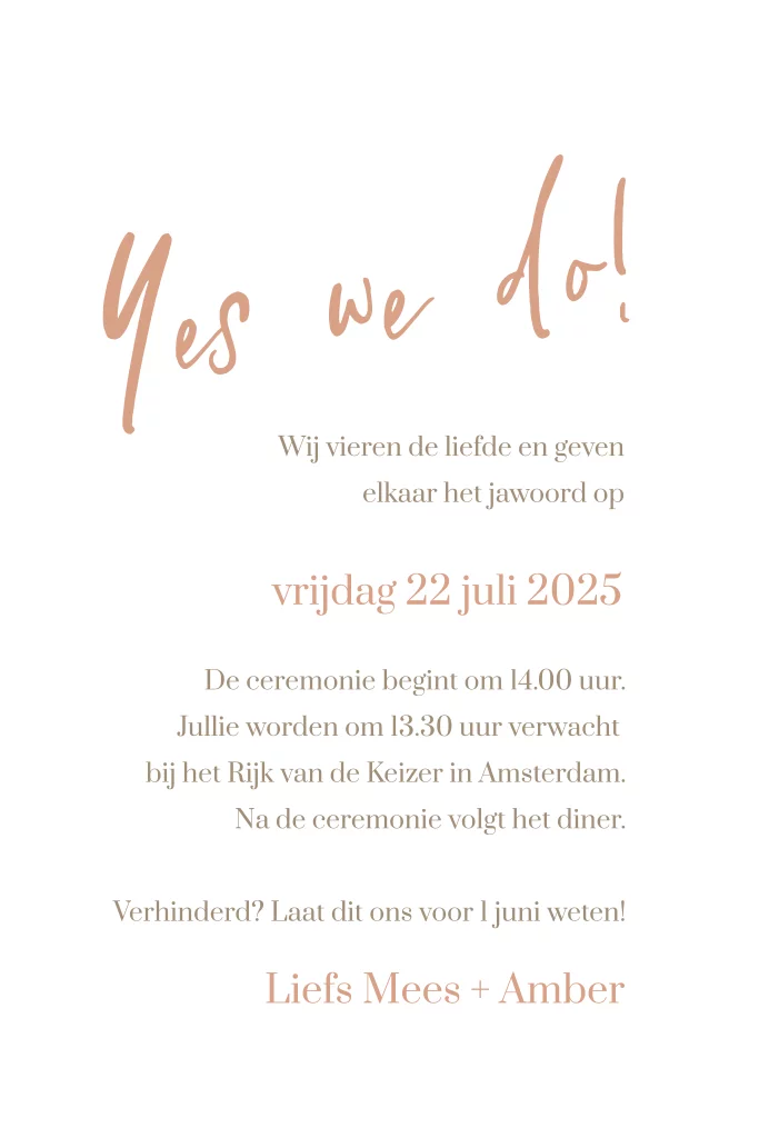 Een minimalistische trouwkaart in de kleur roestbruin. Het ontwerp is aan te passen naar eigen wens. Wil je dit design in een ander formaat of heb je nodig bij het ontwerpen? Stuur mij een berichtje, ik help je graag!