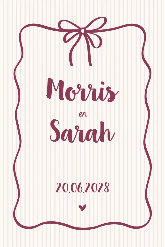 Trouwkaart met met speels kader en strik. Pas het design aan naar eigen wens. Wil je dit ontwerp in een ander formaat, of heb je hulp nodig bij het ontwerpen? Stuur een berichtje, we helpen je graag verder!