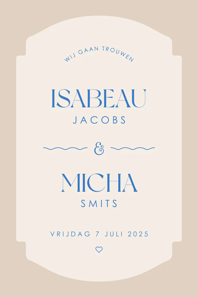 Een moderne trouwkaart met speelse typografie in een ovale vorm. Pas het design aan naar eigen wens. Tip: kies voor het papiersoort 'linnen' voor een extra luxe uitstraling. Wil je dit ontwerp in een ander formaat, of heb je hulp nodig bij het ontwerpen? Stuur mij een berichtje, ik help je graag!