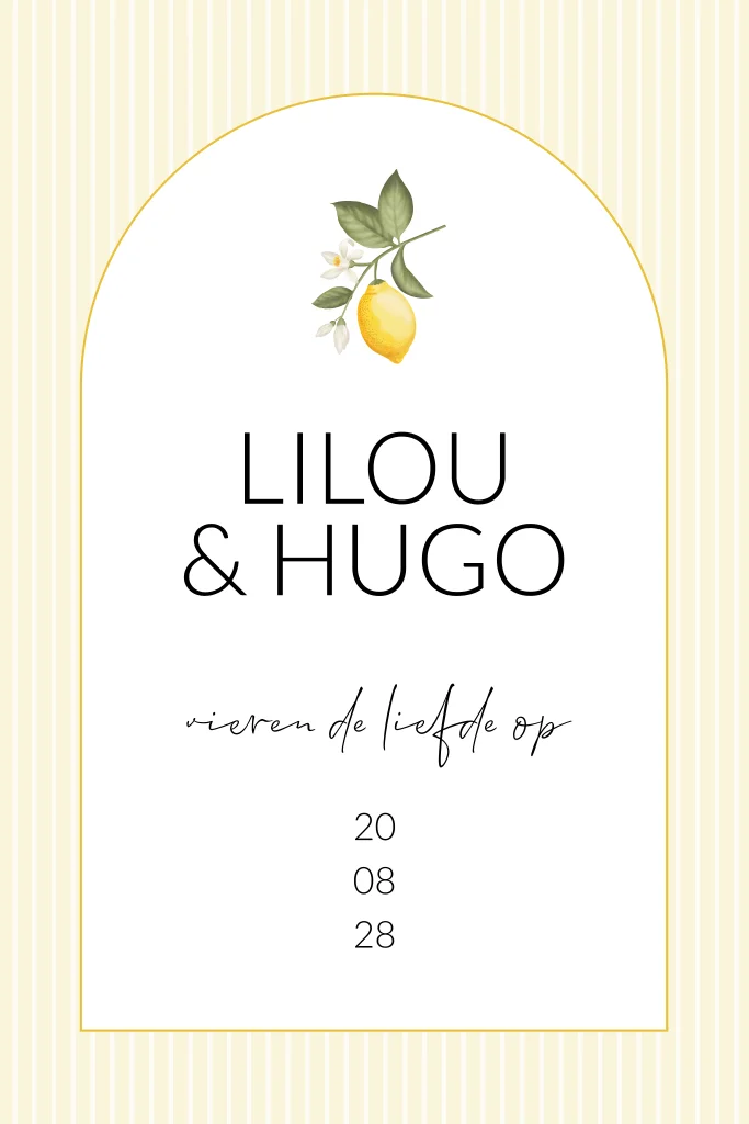 Zomerse trouwkaart met citroen. Pas het design aan naar eigen wens. Wil je dit ontwerp in een ander formaat, of heb je hulp nodig bij het ontwerpen? Stuur een berichtje, we helpen je graag verder!